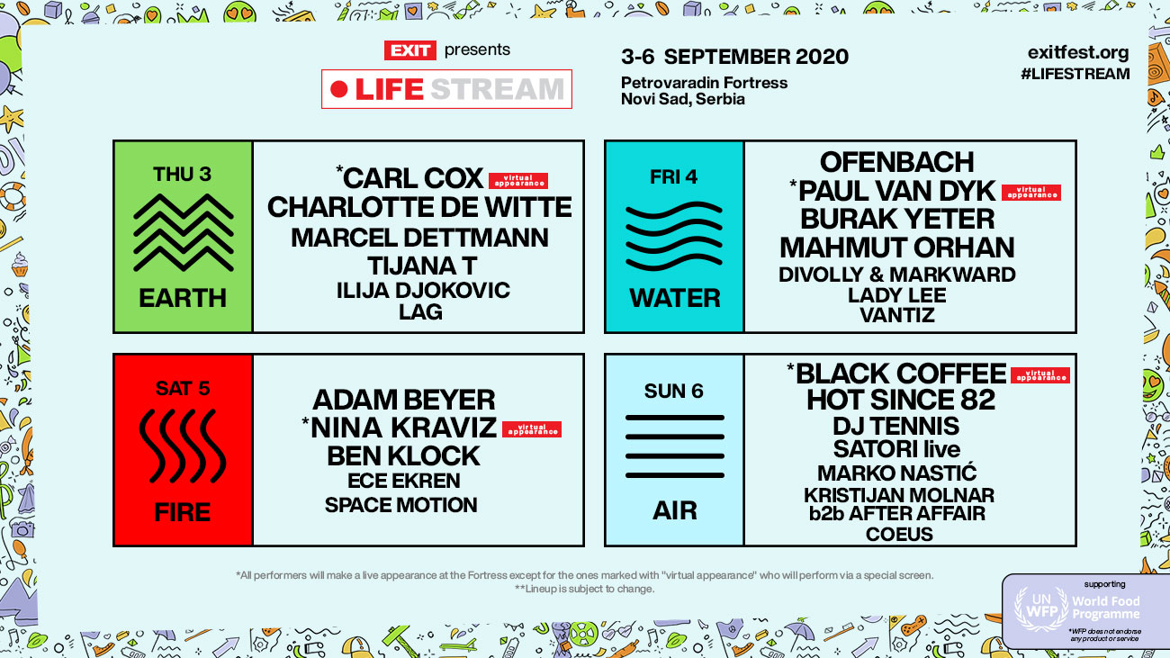 Life Stream, projekat koji EXIT realizuje u saradnji sa Svetskim programom za hranu Ujedinjenih nacija, najvećom humanitarnom organizacijom na svetu koja se bori protiv gladi, u online izdanju tokom dva produžena vikenda – od 17. do 20. septembra i od 24. do 27. septembra – putem zvaničnog sajta i Facebook stranice EXIT festivala, moći će da prate milioni širom sveta, kojima će pored humanitarnih i ekoloških poruka, tokom programa biti predstavljene i brojne kulturne i turističke znamenitosti Novog Sada i Srbije.