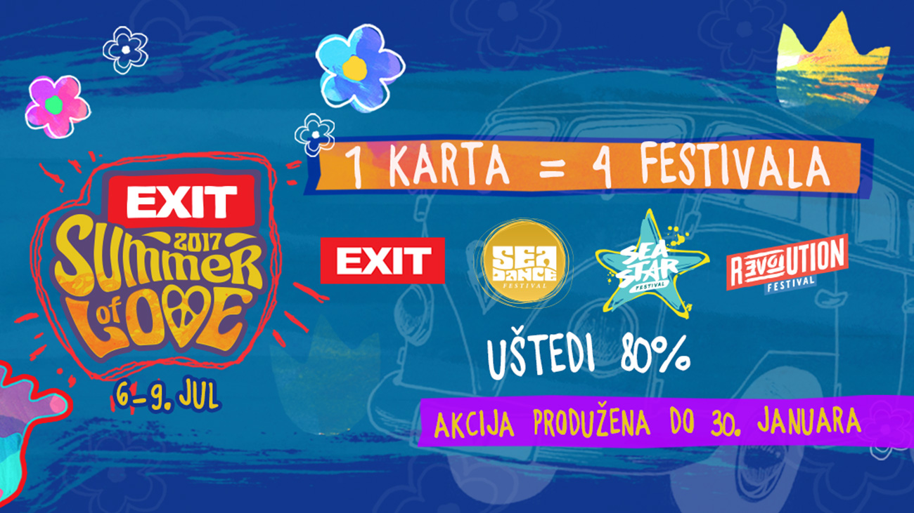Zbog velikog broja molbi fanova akcija „1 karta=4 festivala“ biće produžena još do 30. januara. Svi već postojeći ili budući kupci ulaznice za EXIT festival dobiće na poklon i ulaznice za preostala tri festivala EXIT Leta ljubavi 2017, za Sea Star festival u Hrvatskoj (26. i 27. maja), Revolution Festival u Rumuniji (od 1. do 3. juna), te Sea Dance festival u Crnoj Gori (13-15. jula). Svi kupci, postojeći ili budući, svoje EXIT ulaznice moći će lako da registruju od 1. do 28. februara.