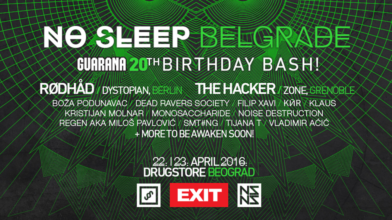 No Sleep, platforma za promociju nezavisne elektronske muzike i savremene kulture, čije sedište je čuvena No Sleep Novi Sad bina na Exit festivalu, organizuje prvi No Sleep vikend u beogradskom klubu Drugstore 22. i 23. aprila. No Sleep platforma je nastala u saradnji Exita i kultnog domaćeg brenda GUARANA, koji ovom prilikom slavi 20. rođendan, a program prvog beogradskog izdanja predvode nemački tehno heroj Rødhåd i francuski elektro doajen The Hacker. Za vikend bez spavanja u Beogradu pobrinuće se i ovdašnja scena koju će u popularnoj „tehno katedrali“ predstavljati Tijana T, Boža Podunavac, Filip Xavi, Noise Destruction, Kristijan Molnar, Monosaccharide, Klaus, Dead Ravers Society i brojni drugi.