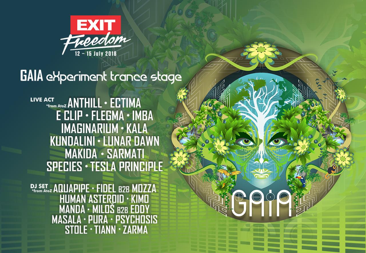 Pojam “gaia” na starogrčkom znači “zemlja” i prikladan je naziv za ovu binu u okviru EXIT Freedom poduhvata, jer srž psy-trance pokreta je ideja da jedina stvar koje čovečanstvo ne sme da zaboravi, kao deo planete Zemlje, jeste da čini zajednicu koja ima obavezu da čuva tu istu Zemlju, kao što je ona čuvala njih dok smo odrastali. Ideja slobode prožima se kroz sve kutke, tunele i rovove EXIT festivala, te će i ekipa zadužena za vrhunski provod na Gaia Experiment Trance bini, nadahnuta pravim vrednostima, publici pružiti impresivni psy-trance show i usput predstaviti fenomenalne inostrane i domaće umetnike audio-vizuelne radinosti.