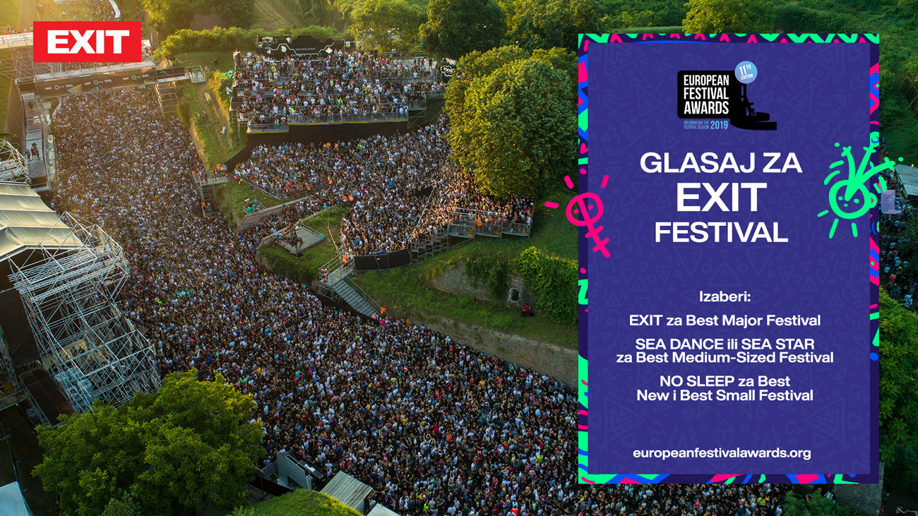 Glasanje za Evropske festivalske nagrade trajaće do 30. novembra. Glasa se na zvaničnom sajtu Evropskih festivalskih nagrada, europeanfestivalawards.org ili putem ovog linka izborom za EXIT u kategoriji „Best Major Festival“, izborom Sea Star ili Sea Dance festivala u kategoriji „Best Medium-Sized Festival“, te izborom No Sleep festivala u „Best New Festival“ i „Best Small Festival“ kategorijama.