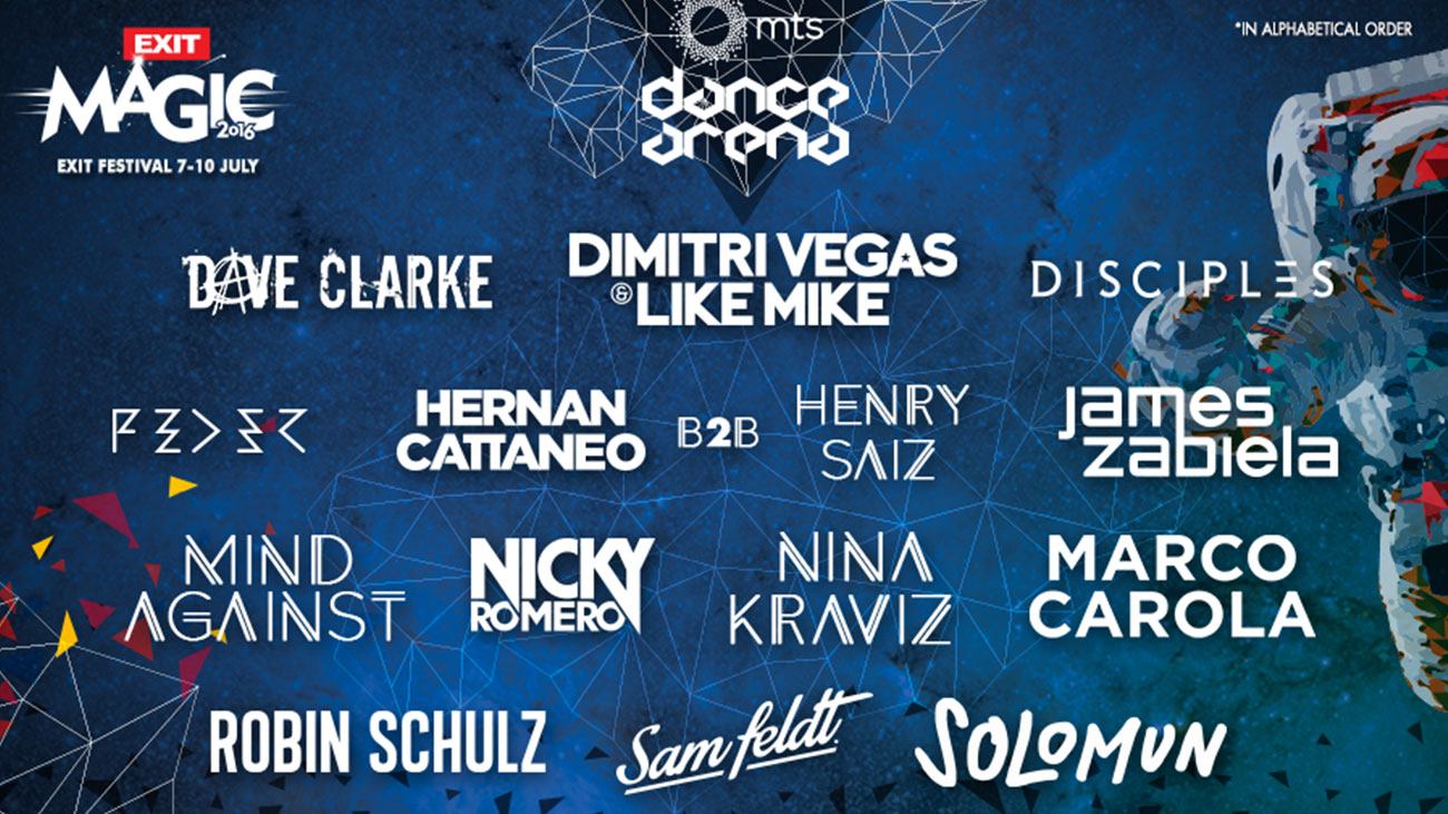Zvanično Najbolji evropski festival za 2016. godinu, Exit festival održaće se ove godine od 7. do 10. jula na Petrovaradinskoj tvrđavi, a zatim Exit Avantura putuje na Jadransko more radi trećeg Sea Dance festivala od 14. do 16. jula. Nastupe su već potvrdili Ellie Goulding, Wiz Khalifa, Hurts, Bastille, Dimitri Vegas & Like Mike, Stormzy, Lost Frequencies, Solomun, Robin Schulz, Nicky Romero, Cock Sparrer, Anti-Flag, Dub Pistols, DJ Hype, Andy C, Tommy Four Seven i brojni drugi.