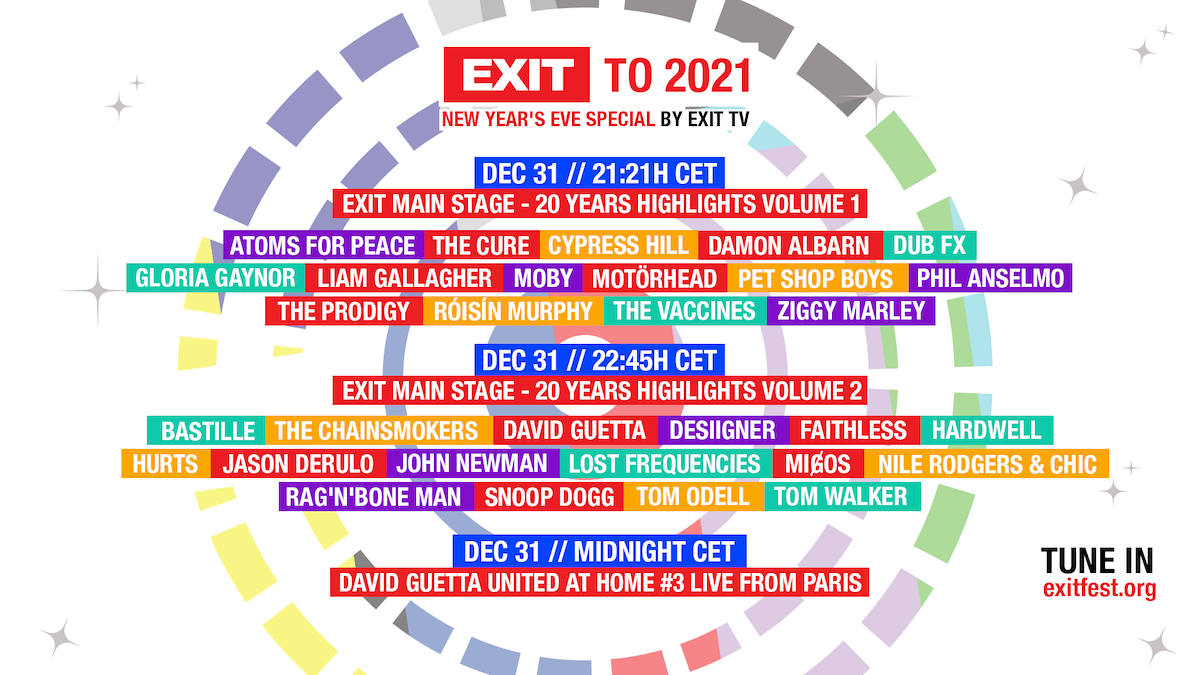Novogodišnji specijal „EXIT to 2021“ sastoji se od nekih od najznačajnijih trenutaka koji su u proteklih 20 godina zajednički doživljavani na glavnoj bini festivala i obuhvatiće nastupe muzičkih giganata kao što su The Cure, The Prodigy, Migos, The Chainsmokers, Motorhead, Moby, Faithless, Liam Gallagher, Jason Derulo, Atoms For Peace, Damon Albarn, Hurts, Pet Shop Boys, Nile Rodgers i mnogi drugi.