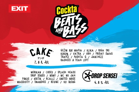 Drop Sensei zaduženi su za program dva dana na novoj Cockta Beats&Bass bini, te će program u četvrtak, 6. jula i u nedelju, 9. jula predvoditi predstavnici Blackout etikete, Merikan iz Napulja, beogradski drum’n’bass kolektiv Codex, zatim tvorci kompilacije „Mirror Universe“ izdate na etiketi „Eatbrain“ Splash Heads, smederevski bass izdanak Nemy, ali i domaćini bine Drop Sensei. Njima će se u četvrtak i nedelju pridružiti i MC Bo Jah, Fokus, Kritik, Rcallz, United Noise, Massivity, Dbanshee, Revibe i Vu Skeng. Novosadska organizacija CAKE Beats poznata po predstavljanju i selekciji najmodernijih tendencija u savremenom hip-hopu u petak, 7. i subotu 8. jula na novoj bini ugostiće odličnog beatmakera i člana jednog od najvrelijih producentskih kolektiva 808 Mafia, Gežina, kao i predstavnike novog talasa novosadskog hip-hopa, Kliku. Njima će se pridružiti i jedan od najboljih repera koje je Novi Sad iznedrio, predstavnik Bassivity Digitala, Riga Dri, ali i zagrebački hip-hop klan KUKU$. Na novoj Cockta Beats&Bass bini u okviru Cake Beats večeri nastupiće i Vatra, DJ sastav iz Beograda koji je nedavno proslavio svoj šesti rođendan, vrhunski splitski DJ Vrh, zagrebačko klupsko veče posvećeno underground zvuku Trapez, maestri na gramofonima DJ Laki i DJ Rokam ujedinjeni u Friday Swag, kao i najtvrđi momci novosadskog asfalta, Pushta G, Janchezz i domaćini Rasheed & Yeah Left.