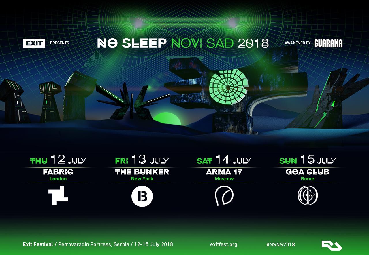 This year, #NSNS2018 promo tour starts in Novi Sad, from the depths of Petrovaradin fortress, where Dasha Redkina, the resident DJ of Arma 17, will perform in the Novi Sad’s infamous club Tunnel on April 13. Next station is on the other side of the ocean, as the Bunker team will be doing the No Sleep New York party on April 28, with Exit’s well-known residents Tijana T and Lag. The tour comes back to Belgrade’s Drugstore on May 11, also with the residents of Moscow’s Arma 17, with No Sleep Rome to follow in Goa Club on May 17. Final weekend begins on May 24 in Moscow and the grand finale is the No Sleep London, set for the British bank holiday on May 26, in both rooms at one of the most famous clubs in the world – Fabric!