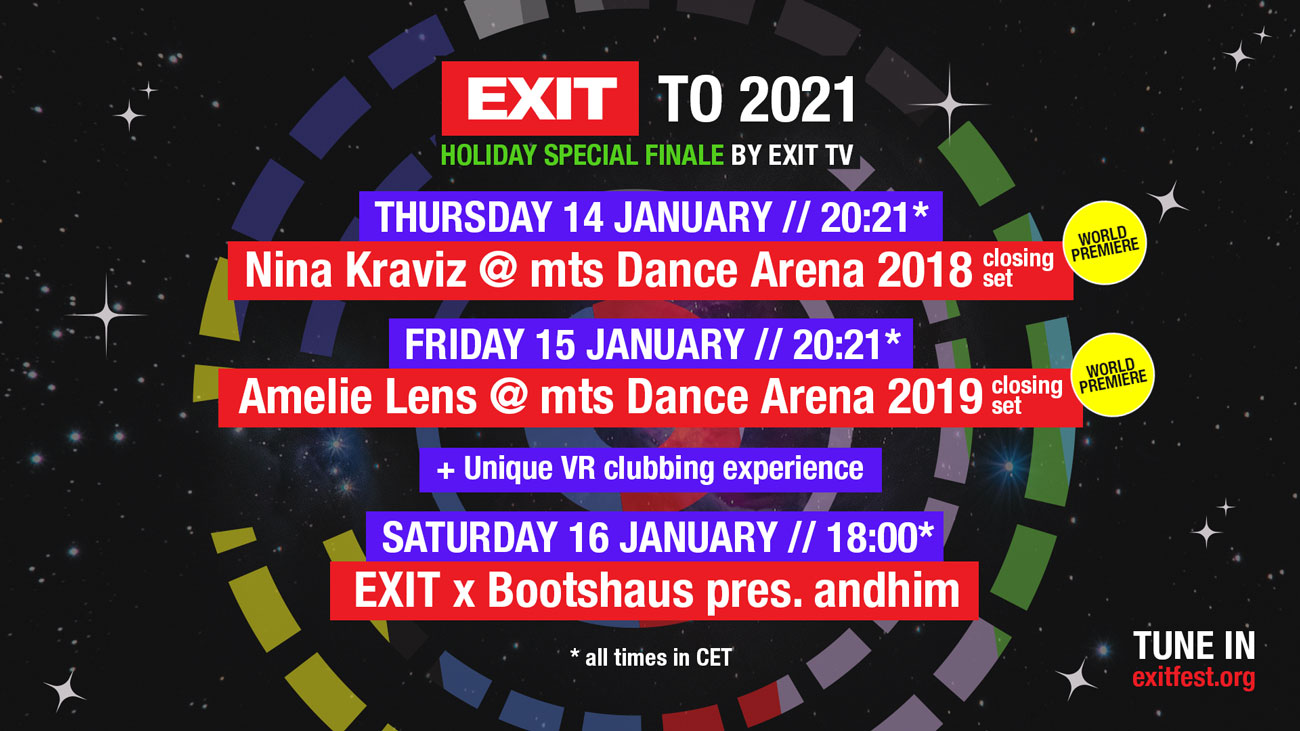 Celebrating the Serbian New Year on Thursday, January 14 and Friday, January 15, will be the two legendary closing Arena performances of Nina Kraviz and Amelie Lens, which have not been broadcast until now, presented on EXIT’s Facebook and YouTube channels. On Saturday, January 16, the audience will have the opportunity to experience an innovative new form of VR parties, in which EXIT, in cooperation with Bootshaus club and the innovative Sansar platform, will bring a virtual live performance by house masters andhim.