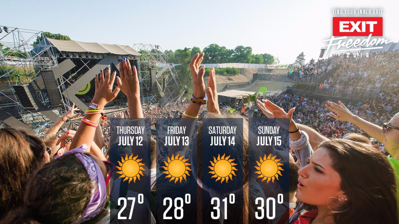 All weather forecast websites are unanimous – Novi Sad is going to have sunny skies with no rain from July 12 to 15, a perfect setting for enjoying the best music performances during the night or daytime chilling in EXIT Village and official EXIT afterparties raving.