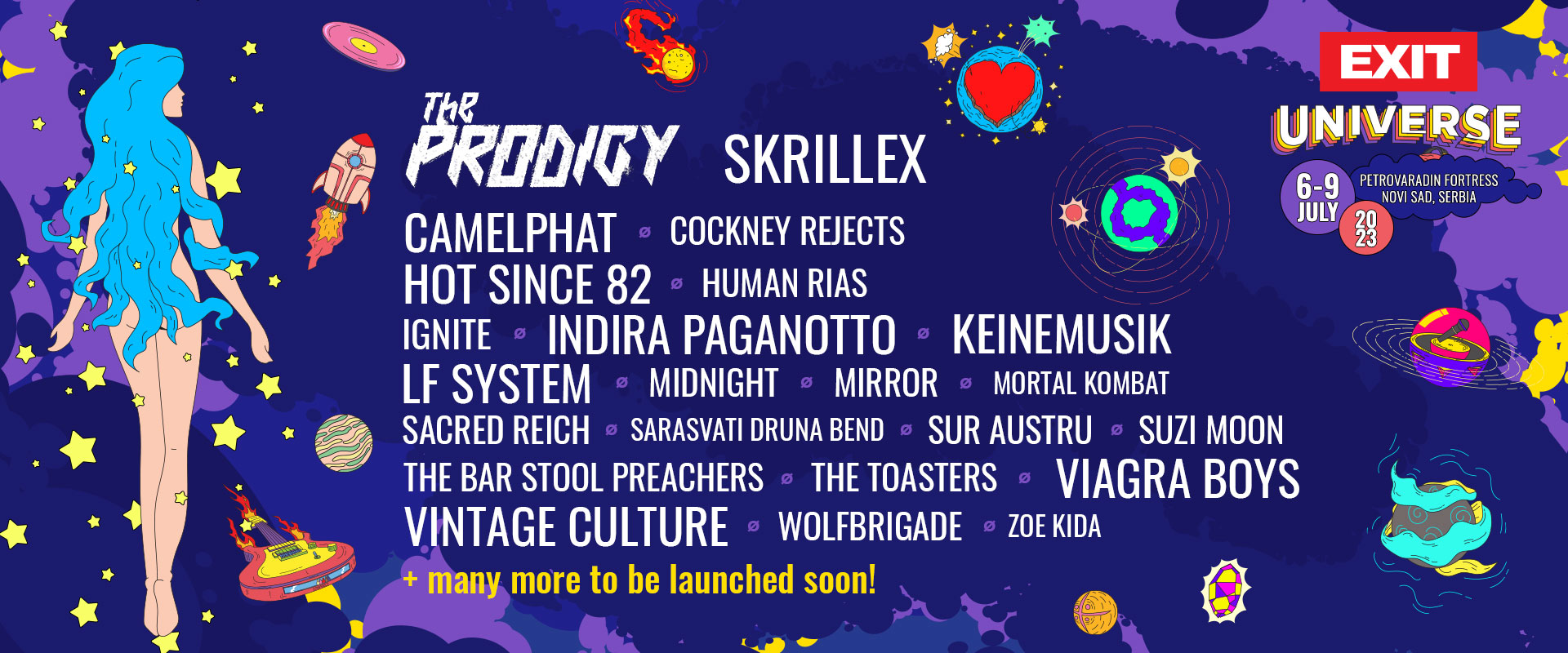 El cartel de EXIT 2023 también estará encabezado por el revolucionario de la música electrónica y ocho veces ganador de los premios Grammy, Skrillex; la sensación del rock Viagra Boys; el colectivo Keinemusik, uno de las actuaciones electrónicos más buscadas de la actualidad, así como el dúo CamelPhat, Hot Desde el 82, LF System, Vintage Culture e Indira Paganotto. También se han confirmado las actuaciones de The Toasters, Suzi Moon, Cockney Rejects, Human Rias, Mortal Kombat, Zoe Kida y muchos otros. Un total de 23 artistas están listos para ocupar su lugar en EXIT Universe en cinco de los escenarios favoritos de EXIT: Main Stage, mts Dance Arena, Visa Fusion, Explosive y Pachamama del 6 al 9 de julio de 2023.