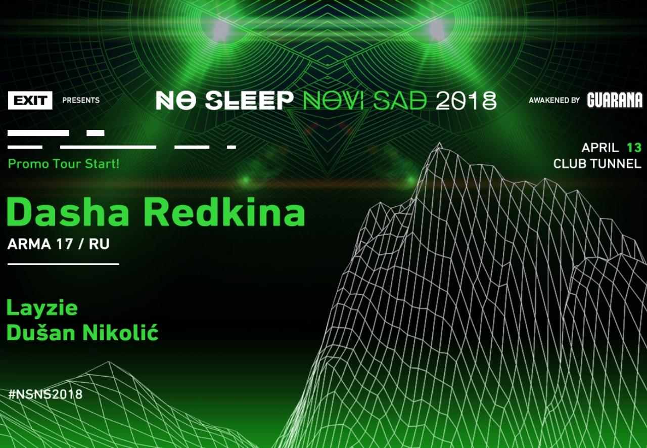 Ove godine #NSNS2018 promotivna turneja preći će i Atlantski okean, a pre nego što budu objavljeni svi ovogodišnji klubovi partneri, te kompletan ovogodišnji program za četiri besane noći na Exitu, poznato je odakle ove godine sve počinje! Naravno, upravo iz Novog Sada i to sa Petrovaradinske tvrđave gde će 13. aprila u novosadskom klubu Tunnel biti održana prva ovogodišnja No Sleep promo žurka na kojoj će glavna gošća biti ruska DJ heroina i rezidentkinja najpoznatijeg ruskog umetničkog kolektivna Arma 17 – Dasha Redkina! Domaću podršku pružiće joj rezidenti Dušan Nikolić i Layzie.