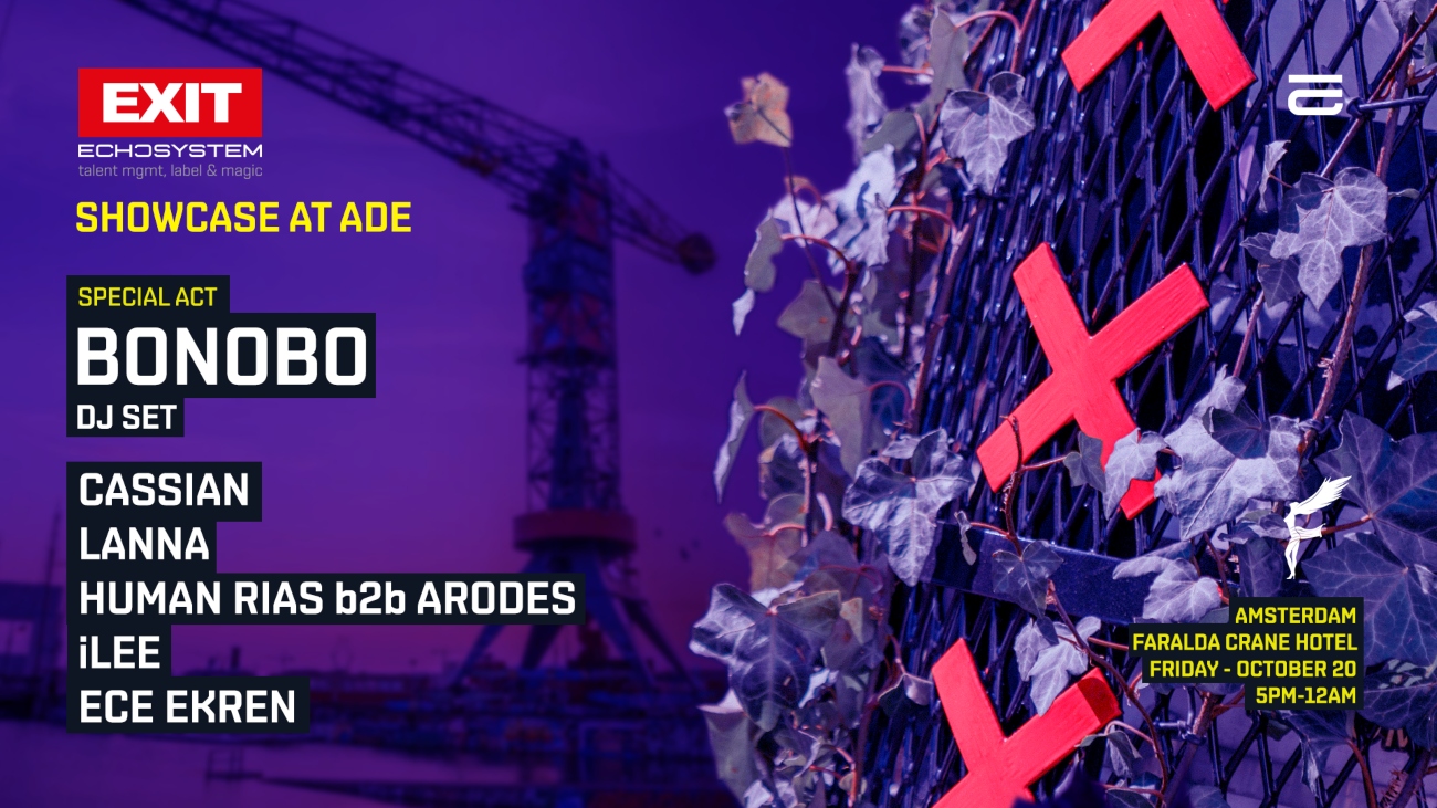U Faralda Crane-u, jednom od najspecifičnijih klubova i 5* hotela na svetu, smeštenom čak 50 metara iznad Amsterdama, Exitov događaj 20. oktobra predvodiće jedan od najtraženijih umetnika elektronske muzike Bonobo. Provod na vrhu monumentalnog građevinskog krana do usijanja će svojim prepoznatljivim zvukom upotpuniti Cassian, dok će iste večeri biti predstavljen i showcase jedinstvenog sveobuhvatnog centra za razvoj globalnih muzičkih talenata EXIT Echosystem. U okviru ovog showcase-a nastupiće prva potpisnica Echosystema, vunderkind elektronske scene Lanna, kao i Human Rias b2b Arodes, iLEE i Ece Ekren, dok će upravo na ovom događaju EXIT lansirati i ekskluzivne novosti.