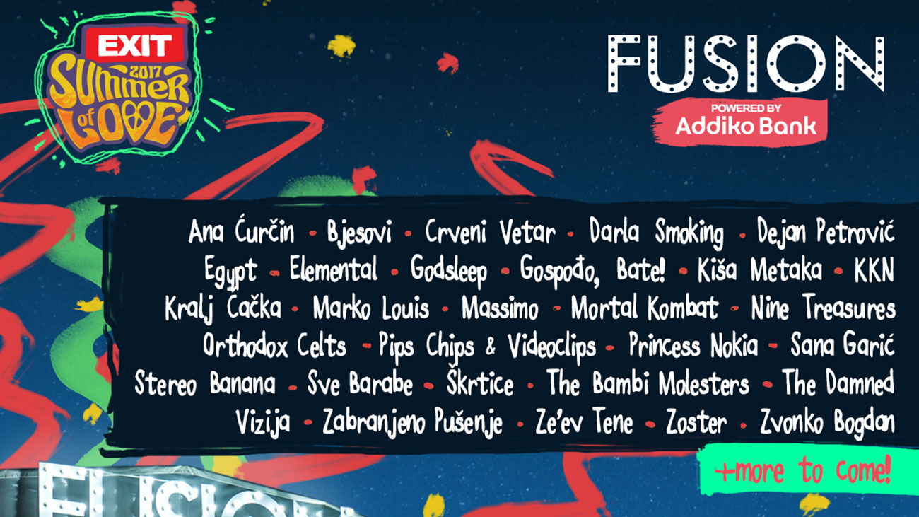 Jedna od miljenica EXIT publike, Addiko Fusion bina, ove godine biće domaćin 30 muzički raznolikih sastava i izvođača iz zemlje, regiona i sveta. Široka lepeza muzičkih pravaca koja će biti predstavljena na trećoj najvećoj bini festivala osiguraće provod za pamćenje svim ljubiteljima tokom četiri dana festivala, od 6. do 9. jula. Sjajnu postavu ovogodišnjeg Fusiona čine, između ostalog, The Damned, Princess Nokia, Zabranjeno Pušenje, Orthodox Celts, KKN, Elemental, Bjesovi, Massimo, Zvonko Bogdan, The Bambi Molesters, Pips Chips & Videoclips i mnogi drugi.