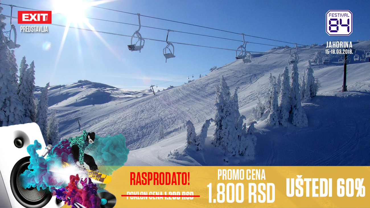 Juče ujutru su na blagajne širom Bosne i Hercegovine, ali i u svim državama regiona i u celom svetu, stigle prve ulaznice za novi događaj u organizaciji EXIT tima, Festival 84! Kontigent simbolično određen na tačno 1984 ulaznice po poklon ceni sa 70% popusta planuo je u rekordnom roku za nešto više od 7h, mnogo pre 24h koliko je bilo predviđeno za ovu akciju! Odmah nakon toga pušten je još jedan kontigent promotivnih ulaznica koje su nastavile odlično da se prodaju, tako da je do zatvaranja blagajni preko 3.000 posetilaca širom regiona i sveta obezbedilo svoje ulaznice za predstojeće gostovanje Exita na olimpijskoj Jahorini! S obzirom na to da najveći zimski festivali na svetu broje oko 7-8.000 ljudi dnevno, početak prodaje pokazuje da će već u prvoj godini Festival 84 postati jedan od najvećih zimskih festivala Evrope i sveta i da će pozicionirati Jahorinu među najatraktivnije zimske centre u Evropi!