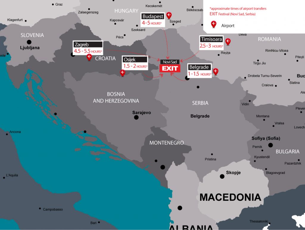 Depuis votre point de départ, l’aéroport le plus proche de l’EXIT (Novi Sad, Serbie) est l’aéroport de Belgrade Nikola Tesla, à 80 km soit entre 1h et 1h30 de trajet.