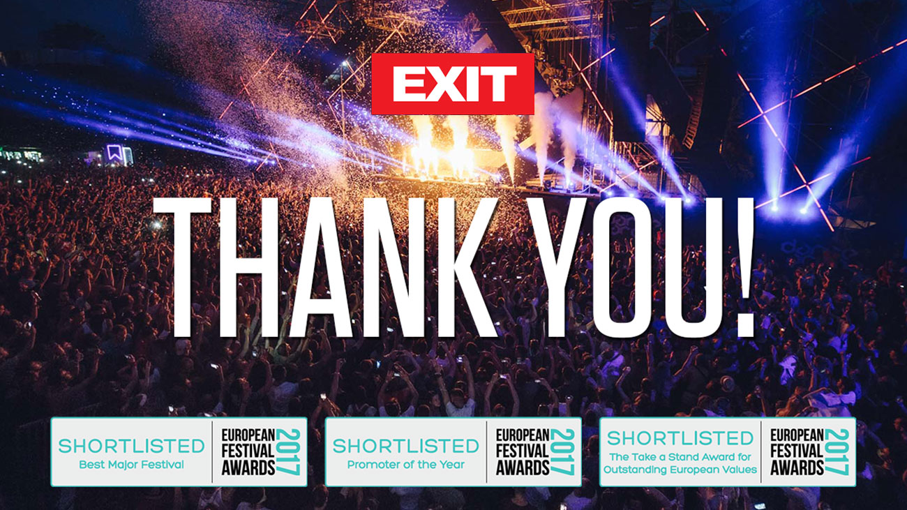 Na zvaničnom izboru za najbolje festivale u Evropi (European Festival Awards) na kojem učestvuje vrtoglavih 350 festivala iz više od 35 zemalja starog kontinenta, sva četiri festivala u organizaciji EXIT tima izglasani su među deset najboljih, svaki u svojoj kategoriji! EXIT je glasovima publike i devetu godinu uzastopno izabran u 10 najboljih festivala Evrope i to u glavnoj kategoriji za „Najbolji veliki festival“ zajedno sa ostalim gigantima kao što su belgijski Tommorowland, holandski Lowlands, nemački Wacken Open Air ili susedni Sziget u Mađarskoj.