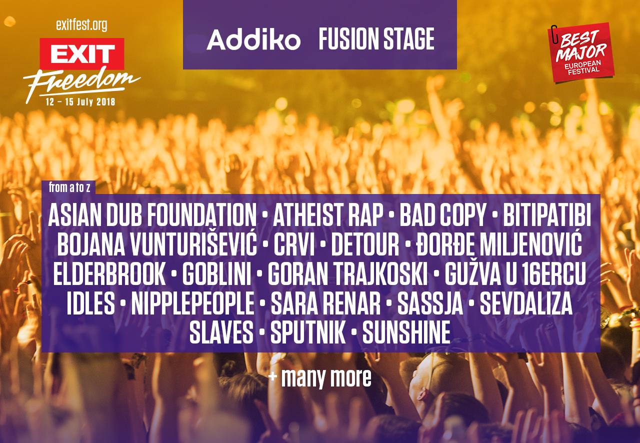Program ove bine tokom završnice EXIT festivala predstaviće šarenu paletu zvukova, te će tako tvrđavom odjekivati, između ostalih, i hit prikladnog naziva “Fortress Europe” aktivističkog rok kolektiva Asian Dub Foundation, čije numere obiluju necenzurisanim stihovima i rifovima koji mogu da sravne sve pred sobom. Pred publiku Addiko Fusion bine kročiće i Elderbrook, mlada zvezda koju bi bilo nezahvalno nazvati samo elektronskim umetnikom, jer crpi energiju iz čitavog spektra žanrova, od soul do gospel muzike, a svet je osvojio hitovima “Could” i “Cola”. Jačinu domaće scene predstavljaće Bojana Vunturišević, prepoznatljiva na sceni po svojim plesnim pokretima i vrsnim vokalima i koju mnogi smatraju jednom od najdragocenijih pojava u novijoj istoriji domaće pop muzike. Novi materijal pred EXIT fanovima u nedelju 15. jula predstaviće domaći sastav Sputnik, inspirisan new wave i indie-pop pravcima.