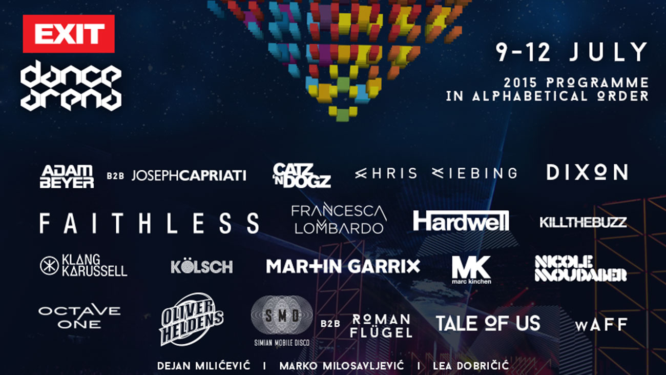 Globalna DJ superzvezda i autor gigantskog dens hita „Animals“ Martin Garrix potvrdio je premijerni nastup u subotu 11. jula na spektakularnoj Exit Dance Areni. Spot za njegov hit pogledalo je preko pola milijarde ljudi na YouTubeu, a ovaj multi-platinasti singl osvojio je najznačajnije evropske i svetske top liste. 18-godišnjeg momka iz predgrađa Amsterdama, magazin Forbes nazvao je najvećom mladom zvezdom u usponu, imajući u vidu da ga je upravo publika izglasala na 4. mesto svetske DJ liste, ispred imena kao što su David Guetta, Avicii, Skrillex i Calvin Harris! Garrix je vodeća zvezda i drugih najznačajnijih svetskih festivala kao što su Tomorrowland ili Coachella, a ove godine imaće čast da zatvori susedni Sziget na glavnoj bini. Noć kasnije, 12. jula, na mts Dance Areni nastupiće i dva prvoplasirana imena sa aktuelne Resident Advisor liste, berlinski lideri novog elektronskog zvuka, DJ i producent Dixon i elektronski duo Tale of Us! Njima će se na svetski slavnoj, elektronskoj pozornici Exit festivala, pridružiti i engleski tandem Simian Mobile Disco, austrijski duo Klangkarussell, istaknuti producenti Roman Flugel i Marc Kinchen (MK), te zvezde u usponu wAFF i Francesca Lombardo.