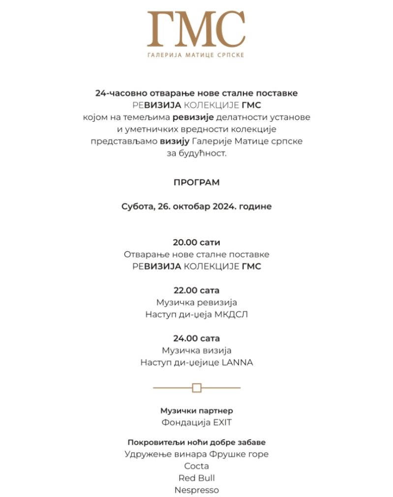 Naime, u subotu, 26. oktobra, u 20 sati, u Galeriji Matice srpske svečano će biti otvorena nova stalna postavka „Revizija kolekcije Galerije Matice srpske ”, kojom će – kako kažu iz galerije – na temeljima revizije delatnosti ustanove i umetničkih vrednosti kolekcije, biti predstavljena vizija GMS za budućnost.