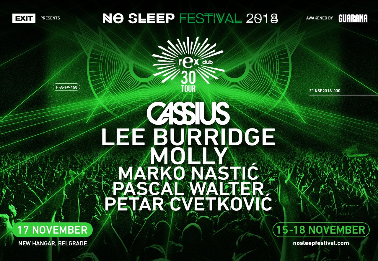 No Sleep Festival u organizaciji EXIT tima i uz podršku popularnog domaćeg brenda Guarana, biće održan na više lokacija u Beogradu, dok će se centralni događaji uz vrhunsku produkciju održati u Novom Hangaru u Luci Beograd koja će svake noći primati nekoliko hiljada posetilaca u svoje industrijsko okruženje. Prve noći u četvrtak, 15. novembra, sa specijalnim „Warehouse Rave“ nastupom, No Sleep Festival otvoriće veliki Fatboy Slim u društvu DJ Tennisa i Marcela Fenglera, a naredne noći na istom mestu strahovitu postavu čine najtraženiji tehno izvođači današnjice Nina Kraviz, Dax J, I Hate Models, Aleksi Perala i drugi.