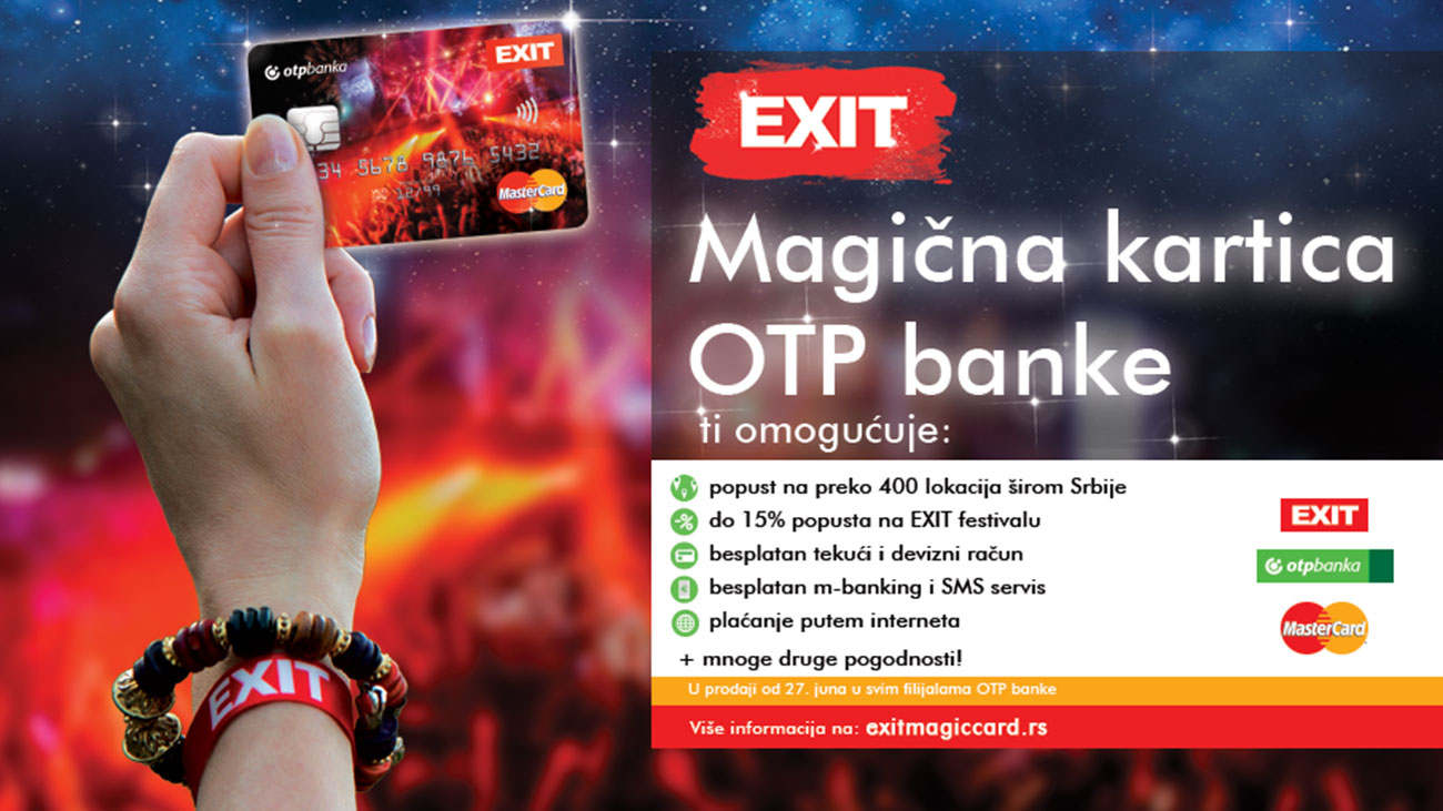 Beograd, 30. jun 2016. godine – EXIT festival, u saradnji sa OTP bankom i kompanijom MasterCard®, predstavlja EXIT magičnu karticu koja je opremljena savremenom MasterCard beskontaktnom tehnologijom. Kartica omogućuje popuste od 5 do 50% na preko 400 lokacija u Srbiji, od bioskopa, knjižara, pozorišta, koncerata do kafića, teretana i prodavnica garderobe, a kompletna lista objekata širom Srbije gde se ostvaruju popusti nalazi se na sajtu Exitmagiccard.rs. Osim toga, da je EXIT platna kartica zaista magična, govori i činjenica da omogućuje i besplatne bankarske usluge OTP banke u vrednosti od 7.200 dinara – besplatno održavanje tekućeg i deviznog računa u OTP banci, besplatan m-banking i SMS servis! Uz magičnu karticu moguće je plaćanje u zemlji i inostranstvu na svim lokacijama sa oznakom MasterCard, kao i plaćanje putem interneta.