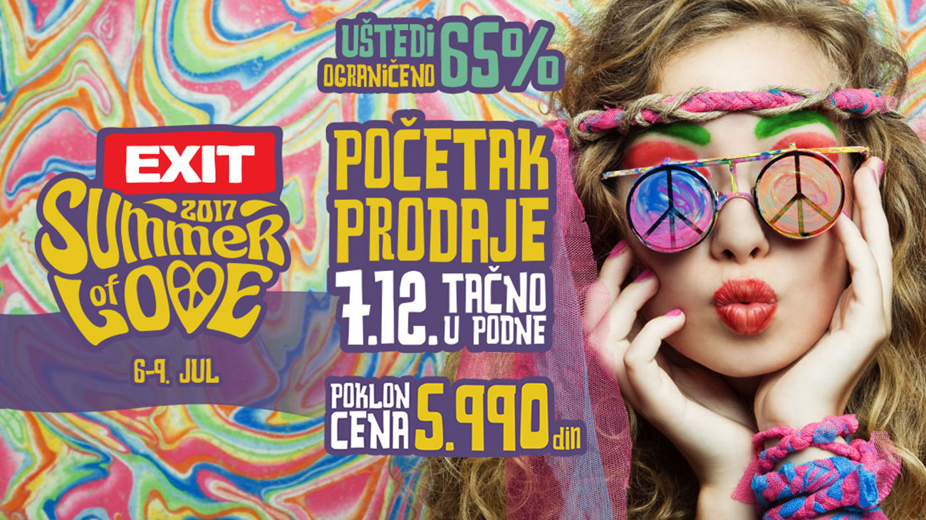 Do idućeg EXIT festivala i velike proslave 50 godina od čuvenog „Leta ljubavi 1967“ ostalo je još osam meseci, a interesovanje za ulaznice je čak dvostruko veće od prethodnih godina! Odmah po završetku ovogodišnjeg festivalskog izdanja, u roku od svega pet dana, za prve ulaznice prijavilo se čak 20.000 fanova iz preko 60 zemalja sveta. Svi prijavljeni u tom periodu, kao i prvi kupci ulaznica od prethodne godine, već nabavljaju svoje ulaznice, i to ranije nego ikad pre. U sredu 7. decembra, tačno u podne, počinje i globalna prodaja ulaznica za EXIT Summer of Love 2017! Ulaznice u Srbiji, kao i prethodnih godina, prodavaće se na sajtu i blagajnama prodajne mreže Gigstix.com, i to po prvoj, poklon ceni od 5.990 dinara, što predstavlja uštedu od čak 65% u odnosu na punu cenu. Prve ulaznice za EXIT svake godine se rasprodaju za svega par sati, a njihova sledeća cena biće viša.