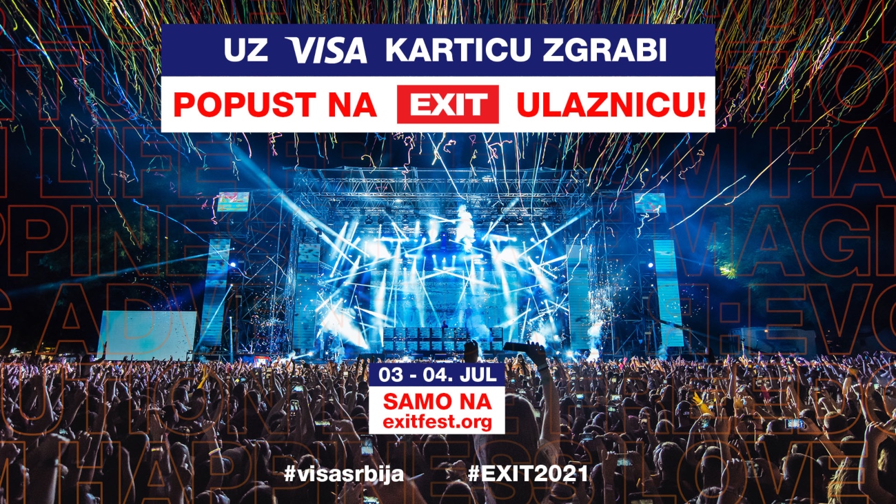 Festival je iza ugla, a još nemaš ulaznicu? Tokom celog vikenda 3. i 4. jula EXIT i Visa daju ti mogućnost da uz online kupovinu jednodnevnih i četvorodnevnih festivalskih ulaznica Visa karticom ostvariš popust od 10 odsto!