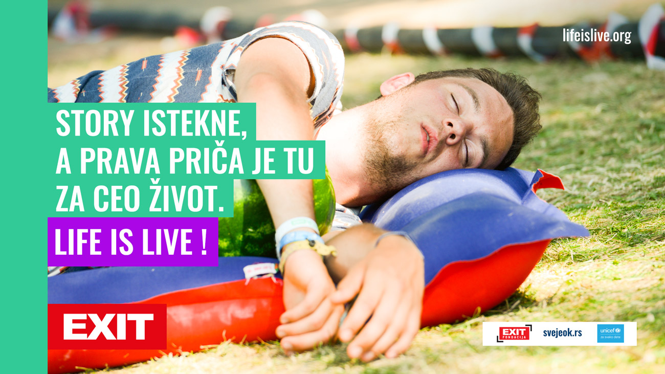Ovom saradnjom EXIT i UNICEF nastoje da mladima pokažu da imaju podršku u uspostavljanju ravnoteže u mentalnom zdravlju, ali i pravljenju balansa između virtuelnog i stvarnog života. Sajt lifeislive.org će tokom ove višegodišnje kampanje biti na raspolaganju svima koji su voljni da se edukuju, da pruže ili potraže pomoć. Jer jedini pravi „story“ je priča za ceo život.