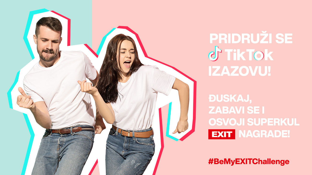 Učestvuj u „Be My EXIT“ TikTok dance izazovu – snimi sa dragom osobom kratak plesni video sa našom zadatom koreografijom, iskoristi original sound sačinjen od hitova EXIT 2021 headlinera, postavi video na svoj TikTok profil i možda baš ti i tvoj partner osvojite superkul nagrade: