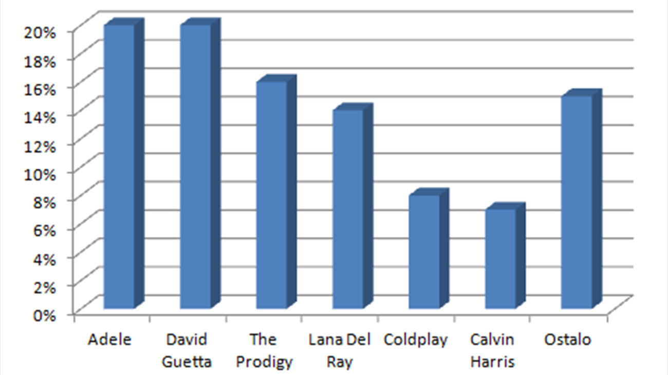 Anketa koju je ove godine medijska grupa Antena sprovela među ciljnom grupom od 20 do 34 godine, nedvosmisleno je pokazala čiji nastupi su najtraženiji među mladim ljudima u Srbiji. Sa ubedljivom većinom i sa po 20% glasova, prvo mesto dele pevačica Adele i najpopularniji svetski DJ i muzički producent David Guetta. Već na drugom mestu nalazi se grupa The Prodigy sa 16% glasova što potvrđuje da su omiljeni bend domaće publike! Na trećem mestu nalazi se Lana Del Ray sa 14%, četvrti su Coldplay sa 8.5%, dok je peto mesto zauzeo Calvin Harris sa 7%!