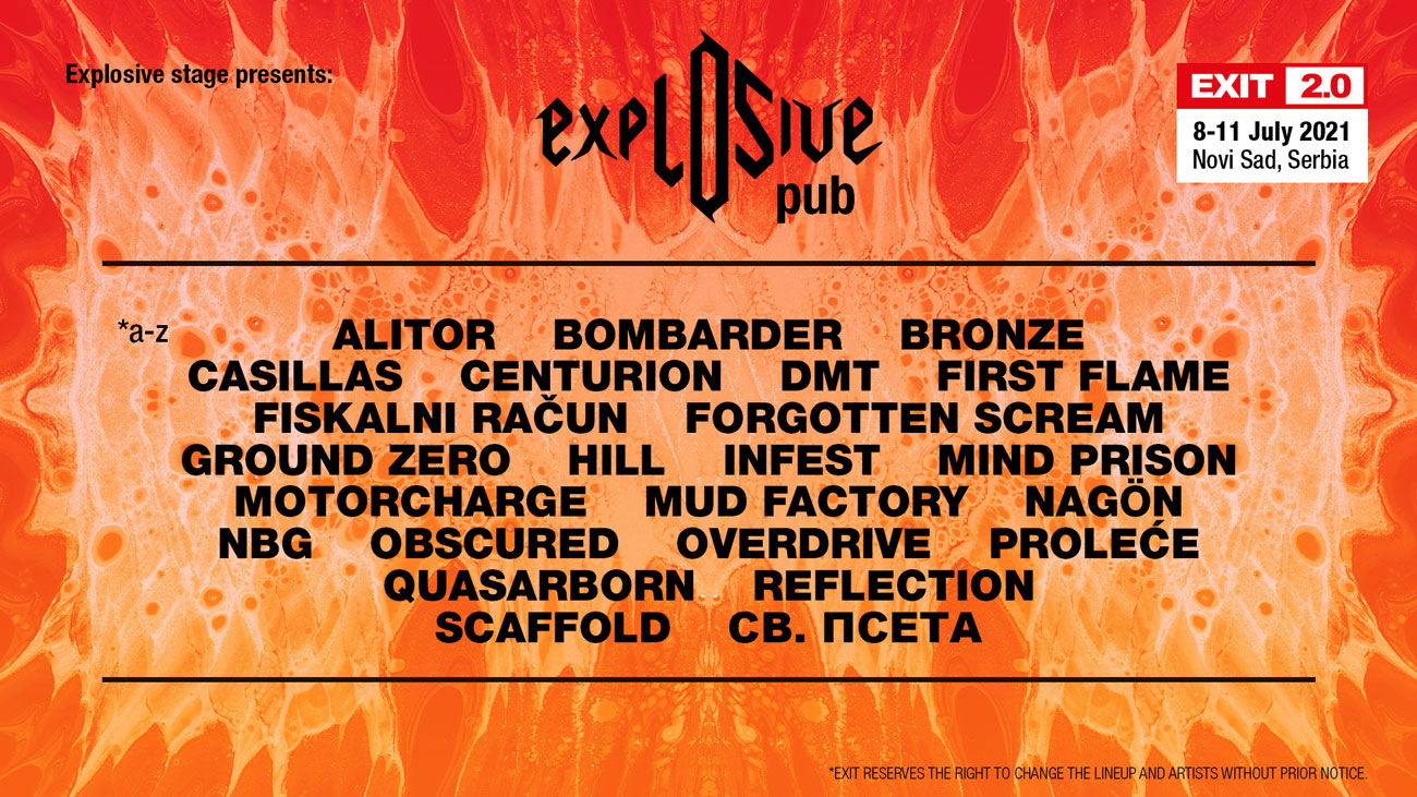 Explosive bina će biti smeštena unutar Explosive paba, poznatog po hardkor duhu i energičnoj atmosferi koju zajedno stvaraju bendovi i fanovi. Ove godine od 8. do 11. jula na Petrovaradinskoj tvrđavi, na proslavi dve decenije Exita, zbog specifičnih uslova u kojima funkcioniše kompletna globalna muzička scena Explosive pab izlazi sa jakom domaćom hevi metal i pank postavom!