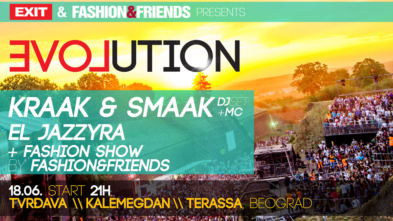 Čuveni holandski sastav Kraak & Smaak predstaviće se beogradskoj publici u specijalnom DJ nastupu, uz zavodljivi vokal Berenice Van Leer, 18. juna u klubu Terassa Lounge na Kalemegdanu. Biće to Evolution žurka, muzičko-modna noć koju zajedno organizuju EXIT i Fashion&Friends, kao zagrevanje za predstojeću, letnju EXIT Avanturu. Da se atmosfera dodatno zagreje, pobrinuće se i niški heroji, grupaEl Jazzyra, a poseban spektakl ove letnje večeri, biće modna revija premium koncepta Fashion&Friends, koji će nam predstaviti neke od trenutno najatraktivnijih urbanih svetskih brendova kao što su Replay, Diesel, Levis, Superdy, Scotch&Soda. Kapacitet ovog događaja je vrlo ograničen i samo u petak će u prodajnoj mreži Gigstix ulaznica prodavati po poklon ceni od 500 dinara, što je 50% popusta u odnosu na konačnu cenu. U prodaji će biti i VIP ulaznice po ceni od 2.500 dinara. Svi kupci ulaznica za EXIT i Sea Dance festivale moći će da uđu besplatno uz prethodnu registraciju putem svog naloga na sajtu Gigstix.com.